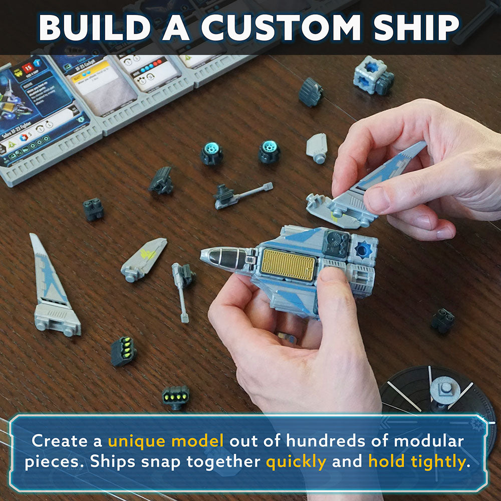 The Starter Box includes everything you need to start playing 1v1 or solo against an AI ship. With 8 unique ship builds, and over 100 individual plastic pieces, you'll have everything you need to construct your perfect ship! In the box: